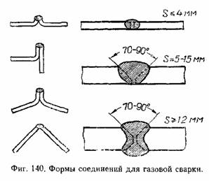 Значительные деформации металла, возникающие при газовой сварке, налагают ограничения на рациональные формы сварных соединений. Из многообразных форм сварных соединений, выполняемых дуговой электросваркой, при газовой сварке пользуются, как правило, лишь простейшим стыковым соединением. Угловые швы и соединения — нахлёсточное и тавровое, образуемые этими швами, при газовой сварке используются лишь в случаях необходимости, из-за затруднений, создаваемых значительными деформациями металла, свойственными газовой сварке. Применяются стыковые соединения как без скоса кромок, без отбортовки и с отбортовкой кромок (особо удобное соединение для газовой сварки), так и с одно- и двусторонним скосом кромок (фиг. 140). Мощность сварочной ацетилено-кислородней горелки, определяемая часовым расходом ацетилена, приблизительно может быть подобрана по эмпирической формуле