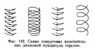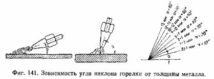 На фиг. 141 показаны обычно применяемые углы наклона оси пламени или оси мундштука горелки в зависимости от толщины металла. В процессе сварки горелке сообщают колебательные движения, и конец мундштука описывает зигзагообразный путь, аналогичный пути, проходимому концом металлического электрода при дуговой сварке (фиг. 142). Горелку сварщик держит в правой руке; если же шов требует добавления присадочного металла, то сварщик держит присадочный пруток в левой руке. Присадочный пруток располагается под углом 45° к поверхности металла, причём конец его должен быть погружён в ванну расплавленного металла. Концу прутка сообщают зигзагообразные колебательные движения в направлении, противоположном движениям горелки, таким образом, что пруток и мундштук горелки движутся всегда навстречу друг другу.