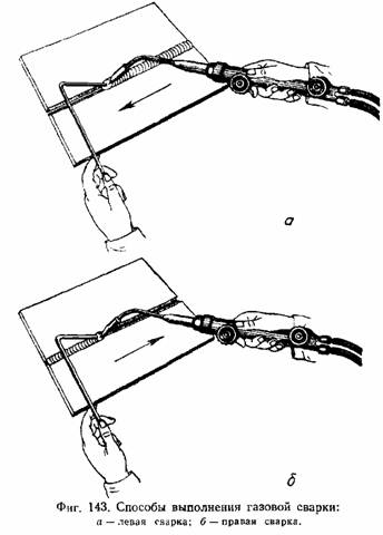 При правом способе сварки впереди перемещается горелка, за ней следует присадочный пруток, расположенный между швом и горелкой. Шов расположен впереди горелки, считая по направлению пламени, пламя направлено назад на сварной шов. При правом способе горелка обычно перемещается слева направо. Оба способа схематически изображены на фиг. 143, а и б.