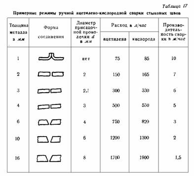 В табл. 17 приведены средние данные производительности и расхода газов для ручной газовой сварки стали нормальными одно-пламенными горелками.