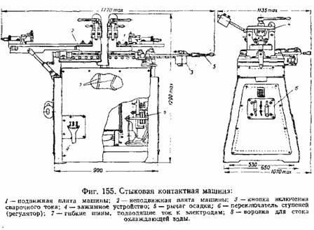 На фиг. 155 изображена контактная машина для стыковой сварки типа АСА-60 с ручным управлением, в которой производится вручную как зажатие деталей, так и осадка в конце сварки. Станина машины делается чугунной литой или сваривается из листовой и профильной конструкционной стали. Машина имеет горизонтальный рабочий стол, однако стыковые машины могут иметь также наклонный или вертикальный рабочий стол. Для зажатия деталей применяются различные зажимные приспособления.