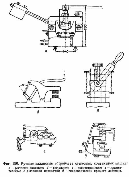 Ручные зажимные устройства контактных машин показаны на фиг. 156. Зажимное устройство должно обеспечивать прочное зажатие изделий, устраняющее возможность смещения изделий в процессе сварки. Для увеличения силы трения между зажимом и изделием одну половину зажима часто делают стальной и снабжают насечкой, вторая половина изготовляется медной или из медного сплава и несёт функции электрода, подводящего ток к изделию. Для разгрузки зажимного приспособления от усилий осадки иногда применяют упоры или упорные приспособления. Упор принимает на себя основную часть давления осадки, а зажим несёт главным образом функции подведения тока к изделию.