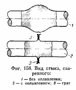 При размыканиях в первую очередь обгорают неровности и выступы на свариваемых поверхностях, которые постепенно выравниваются (фиг. 157). Когда достигнуто равномерное оплавление всей поверхности свариваемого участка, производят быструю осадку с приложением повышенного давления, и в процессе осадки выключают сварочный ток. Приложение значительного давления ведёт к тому, что весь, или почти весь расплавленный металл выдавливается из зоны сварки, образуя так называемый грат, а место сварки получает сравнительно небольшое усиление (фиг. 158). Грат, содержащий большое количество окислов металла, механически непрочен и легко удаляется со сварного стыка.