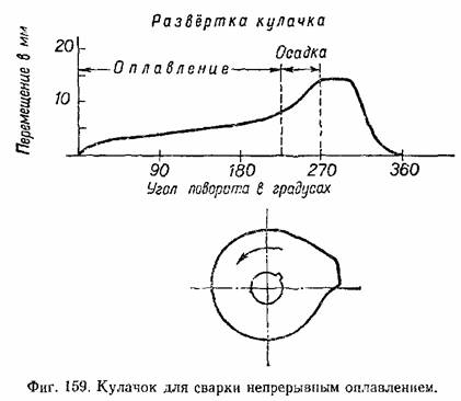 Сварка оплавлением может производиться и при непрерывном сближении деталей, при условии, что оно происходит достаточно медленно и равномерно. Процесс в этом случае идёт следующим образом. Зажатые в машину и разъединённые детали включаются под напряжение вторичной цепи, затем начинается медленная подача деталей в сторону сближения. Соприкосновение происходит сначала лишь в немногих отдельных физических точках, в которых возникают весьма высокие плотности тока, вследствие замыкания сварочной цепи. В результате происходит местное расплавление и испарение металла, который выбрасывается наружу в плоскости стыка действием магнитного поля. Контакт в точках первоначального соприкосновения нарушается, но вследствие непрерывного перемещения деталей в соприкосновение входят новые точки, процесс повторяется, и т. д. Наблюдается непрерывное расплавление и выбрасывание металла из плоскости стыка, между деталями наблюдается непрерывное прохождение тока по кратковременным мостикам жидкого металла. Когда будет достигнуто равномерное и достаточное оплавление всей поверхности стыка, производится осадка значительным давлением, прилагаемым очень быстро и носящим характер толчка или удара. Равномерность подачи, требующейся при сварке непрерывным оплавлением, трудно выполнима при ручной работе, и этот процесс осуществляется обычно лишь на машинах с механизированным электромоторным приводом осадки. Осадочное давление передаётся профильным кулачком (фиг. 159).