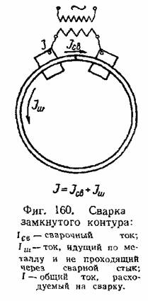 Способ непрерывного оплавления весьма удобен для массового производства однотипных деталей на стыковых машинах с моторным приводом. На стыковых машинах могут быть сварены также стыки в замкнутых контурах, например в ободьях колёс, звеньях цепей и т. п. При сварке замкнутого контура лишь часть тока идёт через свариваемый стык, часть же шунтируется сплошным металлом (фиг. 160). Поэтому при сварке замкнутых контуров приходится увеличивать подводимую мощность, так как полезно используется лишь часть её. Увеличение мощности при сварке замкнутого контура, в зависимости от его размеров, составляет 20—50% мощности, необходимой для сварки открытого незамкнутого контура. Замкнутые контуры могут свариваться как без оплавления, так и оплавлением прерывистым и непрерывным: чаще применяется последнее.