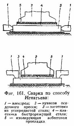 Заслуживает внимания оригинальный способ стыковой сварки, предложенный советским изобретателем А. М. Игнатьевым, имеющий существенное значение для изготовления сварного металлорежущего инструмента. При нормальном способе стыковой контактной сварки электрический ток и давление осадки направлены нормально к поверхности стыка. При сварке по способу Игнатьева давление также прилагается нормально к поверхности стыка, но электрический ток проходит параллельно поверхности стыка (фиг. 161).