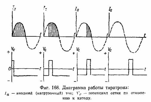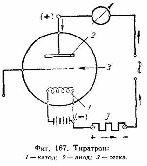 Тиратроном называется трёх-электродная наполненная газом лампа, схематически показанная на фиг. 167. Тиратрон имеет накаливаемый катод, анод и между ними: третий электрод — управляющую сетку. В зависимости от относительного потенциала сетки по отношению к катоду, тиратрон может находиться в запертом или отпертом состоянии для прохождения1 электрического тока. Если потенциал сетки отрицателен по отношению к катоду, то тиратрон заперт и не пропускает электрического тока.