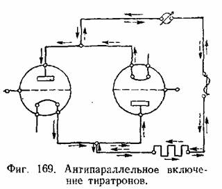 Меняя момент подачи отпирающего импульса, можно изменить продолжительность времени прохождения тока через тиратрон в проводящем полупериоде от нуля до полного полупериода (фиг. 168). При продолжительности времени прохождения тока менее полупериода кривая тока становится несинусоидальной. Таким образом, меняя момент подачи отпирающего импульса на сетку тиратрона, можно менять продолжительность прохождения тока, а тем самым и эффективное его значение. Для использования обоих полупериодов переменного тока применяют два тиратрона в так называемом антипараллельном включении (фиг. 169).