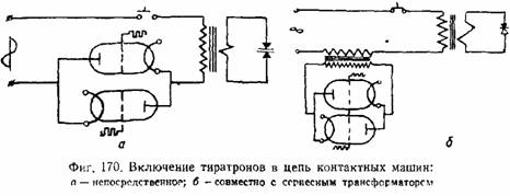 Тиратроны изготовляются для токов в десятки и сотни ампер и могут применяться для включения и выключения токов контактных машин как непосредственно (фиг. 170), так и совместно со вспомогательным сериесным трансформатором, включённым последовательно с первичной обмоткой контактной машины. Во втором случае тиратроны служат для замыкания накоротко и размыкания вторичной обмотки сериесного трансформатора высокого напояжения от 2000 до 10000 е.