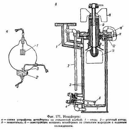 Для более мощных машин и возможности работы без дополнительных дорогих сериесных трансформаторов в настоящее время начинают широко применяться управляемые ионные приборы с жидким катодом — игнайтроны , схема устройства которых дана на фиг. 171, а.