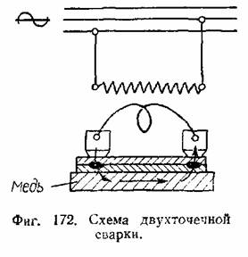 Для увеличения производительности применяется многоточечная сварка, при которой за один цикл работы машины сваривается несколько точек. На фиг. 172 показана схема двухточечной сварки.