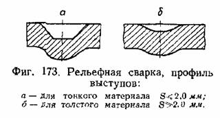 Несколько проще одновременная сварка нескольких точек осуществляется способом рельефной сварки или сварки выступами, являющейся разновидностью точечной Контактной сварки. В этом случае на одной из свариваемых деталей или на обоих (фиг. 173) предварительно выштамповываются выступы (рельефы) в местах, подлежащих сварке. Подготовленные детали закладываются в специальную сварочную машину, носящую название сварочный пресс. Сварка выступами может осуществляться также на мощных точечных машинах с прямолинейным хододом электрода, например на машинах АТА-100 (фиг. 164), причём нормальный точечный электрод заменяется специальным электродом для рельефной сварки, имеющим форму массивной плиты. Одновременно с включением тока верхний электрод сжимает детали и спрессовывает их до полного уничтожения выступов. Таким образом, за один ход машины производится столько сварных точек, Сколько было выштамповано выступов, число их может доходить до нескольких десятков на одной детали. Для получения качественной сварки требуется точная штамповка и плотное прилегание собранных деталей по всем выступам.