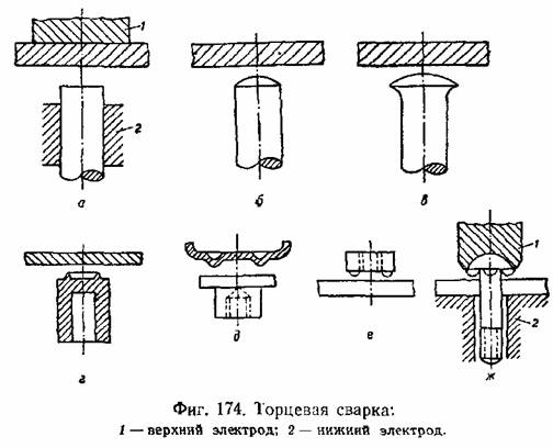 Недостатком рельефной сварки является значительная электрическая мощность, требующаяся для сварочных прессов. Величина этой мощности для сварки одного выступа колеблется от 15 до 30 ква . Давление на один выступ обычно составляет от 200 до 600 кг. Разновидностью рельефной сварки является приварка стержней к листам торцами (фиг. 174, а, б, в, г, д , е и ж). Эта торцевая или Т-образная сварка может выполняться на нормальных контактных машинах с изготовлением несложных дополнительных приспособлений.