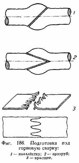 Подготовка под горновую сварку стальных листов и стержней показана на фиг. 186. Если осадка производится, например, проковкой таким образом, что она уменьшает сечение металла места сварки, то прибегают к предварительной высадке соединяемых частей. Несмотря на относительную простоту процесса и отсутствие расхода дефицитных материалов, горновая сварка постепенно отходит на второй план, уступая место современным более совершенным и производительным способам сварки.