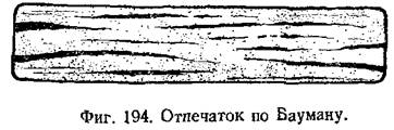 Основной металл должен удовлетворять требованиям соответствующих стандартов и технических условий. Для сварки стали существенное значение имеет химический состав основного металла, в особенности же содержание углерода, затем серы и фосфора. Часто достаточно изменения содержания углерода на несколько сотых долей процента, чтобы заметно изменились сварочные свойства металла, появилась склонность к образованию трещин, закалке и т. д. В отношении серы важно не только среднее содержание, но и равномерность её распределения по объёму металла. Сера, равномерно распределённая по сечению металла, менее опасна, чем местные её скопления, образующиеся вследствие ликвации. Нередко наблюдается, что при общем допустимом содержании серы порядка 0,04—0,05% наблюдаются её скопления в отдельных прослойках с повышением содержания в них до 0,12—0,15%. Такие местные скопления серы опасны и могут служить причиной образования трещин при сварке. Поэтому не всегда достаточно знать общее содержание серы в металле, часто необходимо выяснить и равномерность её распределения, лучше всего об этом можно судить, получив отпечаток шлифа металла по способу Баумана, на котором места с повышенным содержанием серы получают тёмную окраску. На фиг. 194 показан отпечаток по Бауману металла с неравномерным распределении серы. Такой металл может оказаться мало пригодным для сварки даже при общем содержании серы в нём, не превышающем допустимых норм.