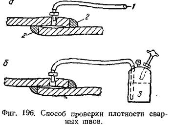 Испытание сварных швов на плотность. Неплотность сварных швов может вызываться не-проварами , трещинами, газовыми и шлаковыми включениями и т. д. Проверка на плотность обычно производится после внешнего осмотра и устранения замеченных дефектов. Испытания на плотность могут производиться различными способами, обусловленными техническими условиями на приёмку данного изделия.