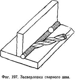 Засверловка позволяет контролировать сварные швы на изделии и служит ценным подспорьем к внешнему осмотру и другим методам испытаний. Засверливание швов производится электрическими, пневматическими или ручными сверлильными машинками. Для сверления применяются спиральные свёрла или специальные конические фрезы диаметром от 6 до 25 мм с углом заточки 90°. Засверловку сварных швов следует вести с расчётом вскрытия всего сечения шва и захвата основного металла по 1—2 мм на сторону. Выполнение засверловки показано на фиг. 197. Засверловка должна иметь возможно гладкую поверхность. Для оценки шва поверхность засверловки шлифуется и травится подходящим металлографическим реактивом для выявления макроструктуры, после чего осматривается в лупу, давая возможность обнаружить непровары , трещины, включения и т. д. По окончании контроля засверловки завариваются; количество засверловок определяется условиями приёмки.