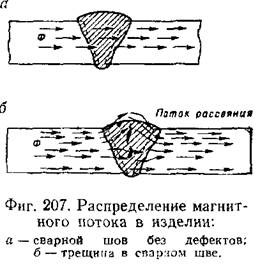 способов магнитного контроля для сварных изделий некоторое применение нашли метод магнитных порошков и индукционный метод. Если намагнитить изделие (фиг. 207) и на пути потока расположить дефектный участок с пониженной магнитной проницаемостью, то он вызовет местное искажение потока рассеяния у поверхности металла. Местный поток рассеяния создаст у краёв дефекта местные магнитные полюса, северный у выхода силовых линий из металла в воздух и южный у входа линий из воздуха в металл.