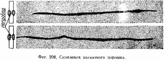 Магнитные полюса могут быть обнаружены, например, по притяжению мелких ферромагнитных частиц. Если взять тонкий порошок ферромагнитного материала, например железа или магнитных окислов железа, и насыпать его на поверхность изделия, то распределение порошка будет неравномерным, образуя местное скопление у дефектов (фиг. 208). В качестве порошка обычно применяются магнитные окислы железа. Из различных окислов железа наиболее магнитна закись-окись Fe30.