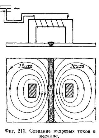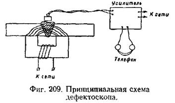 системы Хренова и Назарова. Принципиальная схема дефектоскопа дана на фиг. 209. На контролируемое изделие устанавливается электромагнит переменного тока, создающий переменный магнитный поток в металле изделия. Этот поток создаёт в металле изделия (фиг. 210) систему переменных вихревых токов, которые, в свою очередь, создают переменные потоки рассеяния у поверхности изделия. При однородном сплошном металле без включений и дефектов плотность вихревых токов и потоков рассеяния плавно уменьшается по мере удаления от намагничивающего электромагнита. Наличие дефекта вызывает местное искажение распределения вихревых токов и потоков рассеяния.