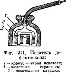 Распределение потоков рассеяния у поверхности изделия исследуется искателем, представляющим собой небольшую индукционную катушку с железным сердечником, закрытую толстостенным экраном из меди или алюминия, образующим корпус искателя (фиг. 211).
