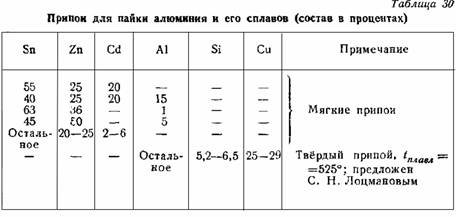 Пайка алюминия и его сплавов представляет большие затруднения вследствие лёгкой окисляемости алюминия с образованием прочной окисной плёнки, а также вследствие часто наблюдающейся слабой сопротивляемости коррозии мест пайки. До настоящего времени задача качественной пайки алюминия не вполне разрешена. Для облегчения процесса пайки иногда применяется предварительное покрытие алюминия медью или никелем, осаждаемыми гальваническим способом. Места пайки в этом случае очищаются травлением серной кислотой, десятипроцентным раствором едкого натра, с последующей промывкой в проточной воде, после чего подвергаются никелированию или омеднению гальваническим способом. Поверхности, покрытые тонким слоем никеля или меди, паяются обычными способами мягкими припоями. Способ гальванического покрытия мест пайки ввиду его сложности, трудоёмкости и довольно высокой стоимости применяется редко. Обычно ограничиваются лишь зачисткой кромок перед пайкой. В этом случае применяются специальные припои для пайки алюминия. Простейшим из этих припоев является технически чистый цинк, дающий удовлетворительные результаты при пайке растиранием и обеспечивающий прочность порядка 9 кг/мм2 однако соединения, паянные цинком, весьма подвержены коррозии. В табл. 30 приведены составы некоторых припоев для пайки алюминия. Припои первый и второй обеспечивают предел прочности не ниже 10 кг/мм2. Припой третий отличается высокой вязкостью и большим относительным удлинением; предел прочности около 8 кг/мм2. Припой четвёртый, отличающийся некоторой хрупкостью, обеспечивает предел прочности до 20 кг/мм2. Как показал опыт, прочность паяного соединения обычно возрастает с повышением температуры плавления припоя.