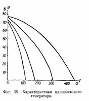 Однопостовой сварочный генератор, т. е. сконструированный для питания одного сварочного поста или одной сварочной дуги, должен иметь круто падающую характеристику (фиг. 29). Таким образом, однопостовой сварочный генератор не поддерживает постоянного напряжения на своих зажимах, которое быстро меняется вместе с изменением нагрузки, падая почти до нуля при коротком замыкании цепи, когда электрод касается изделия. Поэтому однопостовые генераторы часто называются генераторами переменного напряжения. Сила тока такого генератора остаётся более или менее постоянной за время горения дуги.
