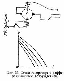 Существует два основных способа воздействия на магнитный поток генератора: 1) применение размагничивающих обмоток на полюсах генератора; 2) использование реакции якоря генератора. Рассмотрим сначала применение размагничивающей обмотки. В этом случае получается генератор с так называемым дифференциальным возбуждением. Схема простейшего генератора с дифференциальным возбуждением показана на фиг. 30.