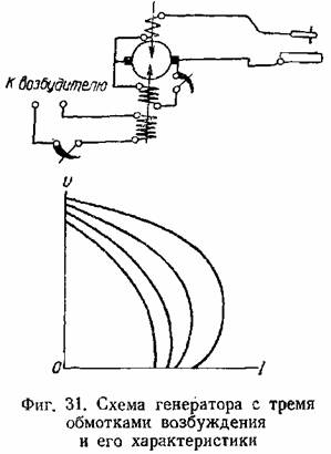 Генераторы с дифференциальным возбуждением подвергались различным изменениям и усовершенствованиям. В Советском Союзе сварочные генераторы с дифференциальным возбуждением под названием СМ производились до конца 1932 г., когда наша промышленность перешла на более совершенные системы. Генераторы СМ имели усложнённую 3-обмоточную систему возбуждения. Помимо независимой и последовательной обмоток генераторы имели ещё шунтовую обмотку, присоединённую к щёткам генератора параллельно с якорем (фиг. 31). Дополнительная шунтовая обмотка введена в схему для изменения формы внешней характеристики генератора. Характеристики 3-обмоточного генератора располагаются выше характеристик 2-обмоточного и имеют более выпуклую форму. Чем меньше сопротивление регулятора в цепи шунтовой обмотки, тем больше разница в характеристиках.
