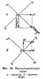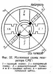 Рассмотрим сварочные генераторы, использующие преимущественно действие реакции якоря. Таким, например, является современный советский генератор СМГ с расщеплёнными полюсами, который изготовляется в больших количествах и является основным типом сварочного генератора, которым пользуется наша промышленность. Для понимания действия генератора СМГ полезно рассмотреть в отдельности его магнитную и электрическую схему (фиг. 32).