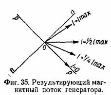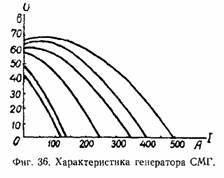 Другая пара сердечников, называемых поперечными, работает при низких насыщениях, и магнитный поток в них может изменяться в широких пределах не только по величине, но и по направлению, от плюс 100% через нуль, до минус 100%. Направление вращения якоря, расположение щёток и магнитодвижущая сила обмоток выбраны таким образом, что магнитодвижущая сила реакции якоря подмагничивает главные сердечники и размагничивает поперечные. Примерное расположение векторов магнитодвижущих сил главных и поперечных полюсов показано на фиг. 34, а. Магнитодвижущая сила полюсов мало зависит от нагрузки. Распределение составляющих магнитодвижущей силы реакции якоря при нагрузке показано на фиг. 34, б. Магнитодвижущая сила реакции якоря изменяется приблизительно пропорционально сварочному току. Переходя от магнитодвижущих сил к магнитному потоку и учитывая насыщенность главных полюсов, легко видеть, что с изменением нагрузки результирующий магнитный поток генератора мало изменяется по абсолютной величине, но ось его поворачивается в пространстве на значительный угол, почти на 90° при изменении нагрузки от 0 до максимальной. При этом изменяется и электродвижущая сила генератора пропорционально косинусу угла отклонения оси магнитного потока от оси полюсов (фиг. 35). В результате получается падающая внешняя характеристика генератора, показанная на фиг. 36.