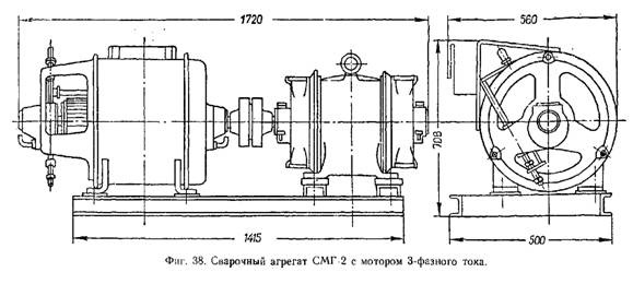 Двигатели внутреннего сгорания удовлетворяют указанным требованиям гораздо хуже, так как они плохо выносят перегрузки, поэтому приходится применять двигатели повышенной номинальной мощности, что увеличивает расход горючего агрегатами. Двигатели внутреннего сгорания имеют сильно колеблющееся число оборотов при изменениях нагрузки. Обычные регуляторы числа оборотов двигателей не удовлетворяют требованиям сварки, поэтому требуются двигатели внутреннего сгорания со специальными регуляторами повышенной точности, отвечающими требованиям сварочных агрегатов. На заводах наиболее распространены сварочные агрегаты с приводными моторами 3-фазного тока. Агрегат СМГ-2 с электродвигателем 3-фазного тока, мощностью 15 квт , 1450 об/мин., на сварочный ток до 320 а показан на фиг. 38.