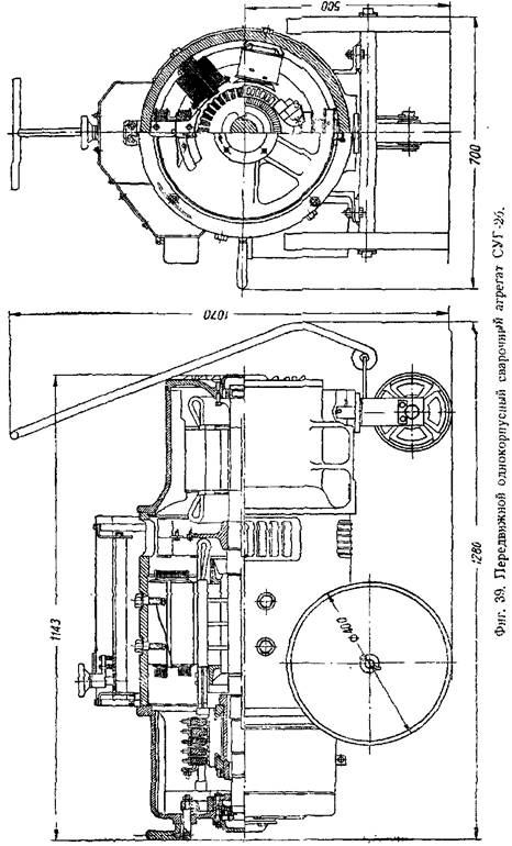 В этом случае генератор и электродвигатель имеют обычно-скользящие подшипники с кольцевой смазкой, что требует точной горизонтальной установки вала генератора по уровню. Поэтому агрегаты эти рассчитаны на стационарную установку. Генератор и электродвигатель устанавливаются на общей сварной фундаментной раме, концы валов соединяются эластичной муфтой; вес агрегата 750 кг. Для уменьшения веса и размеров сварочного агрегата, а также для некоторого повышения его к. .п. д. нашей промышленностью выпускается агрегат СУГ-26 в однокорпусном исполнении, с генератором СМГ-26. Общий вид агрегата показан на фиг. 39.