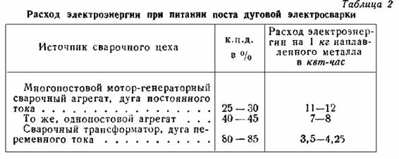 В табл. 2 приведём средние сравнительные данные для ручной сварки по расходу электроэнергии при питании поста дуговой электросварки от силовой сети 3-фазного тока.