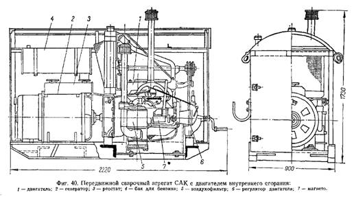 Наиболее распространённым сварочным агрегатом с двигателем внутреннего сгорания мощностью около 30 л. с. является агрегат САК (фиг. 40). Валы двигателя и генератора соединены эластичной муфтой — маховиком и установлены на общей сварной фундаментной раме. Агрегат имеет общий вес около 1100 кг и может удобно перевозиться на грузовом автомобиле. Расход горючего равен 5—6 кг/час при нормальной работе на сварке.