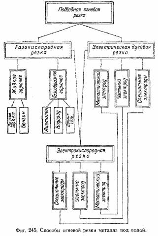 Процесс подводной электросварки был рассмотрен в главе I, здесь рассмотрим процессы огневой резки металла под водой. Трудности резки под водой заставляют применять различные способы в зависимости от местных условий. Классификация способов огневой резки металла под водой приведена на диаграмме фиг. 245.