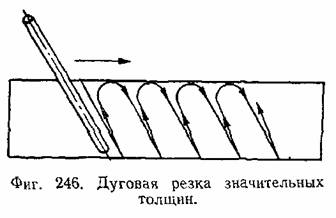 должен обладать достаточной механической прочностью и: образовывать при горении дуги на конце электрода выступающий козырёк, заметно улучшающий процесс резки. Расплавленный металл вытекает из полости реза под действием силы тяжести, выдувается струёй газов и паров, создаваемой дугой, и удаляется шурующими движениями электрода, которые производит резчик, в особенности при резке значительных толщин (фиг. 246). Металл малых толщин (до 10 мм) режется перемещением электрода по линии реза без шурующих движений.