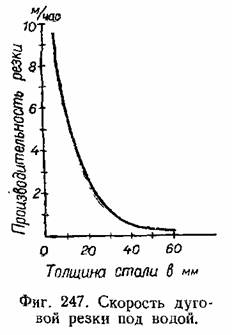 Необходимость мощного источника тока для питания дуги является недостатком подводной дуговой резки, так как не всегда возможно обеспечить место работ таким источником тока. Вторым большим недостатком дуговой резки является быстрое снижение скорости резки с возрастанием толщины разрезаемого металла, как это показано на графике фиг. 247. Поэтому в нормальных условиях рекомендуется применять дуговую резку для резки металла толщиной не свыше 10—15 мм металл толщиной свыше 15 мм б нормальных условиях целесообразнее резать другими способами. Дуговую резку под водой можно производить также угольным или графитным электродом на постоянном токе нормальной полярности. Способ этот пока не нашёл широкого применения. В стадии экспериментальных исследований находится использование для подводной резки специальных электродов, например из карборунда, окислов металлов и т. д. Практического применения подобные электроды ещё не нашли.