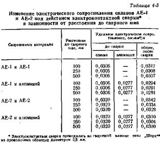 При соединении сплавов АЕ-1 и АЕ-2 с алюминием электроконтактной сваркой оплавлением величина удельного электрического сопротивления представляет собой среднее арифметическое величин электрических сопротивлений исходных материалов (табл. 4-3). При сварке сплавов между собой наблюдается некоторое повышение удельного электрического сопротивления, которое составляет не более 4—6%.