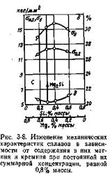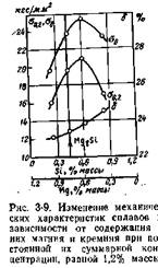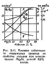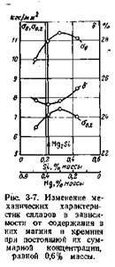 На рис 3-7—3-9 показаны кривые, характеризующие изменение механической прочности сплавов. Максимальное значение предела прочности и предела текучести наблюдается у сплавов с избыточным кремнием, так как у них имеются две упрочняющих фазы: Mg2Si и кремний эффективность термообработки у этих сплавов выше по сравнению со сплавами, расположенными на луче Al —Mg2Si, и сплавами с избыточным магнием.