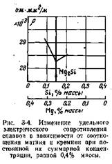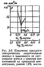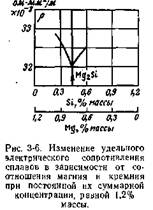 Искажение кристаллической решетки, вызванное второй фазой, всегда меньше, чем искажение решетки, получающееся в результате растворения атомов, поэтому сплавы, в которых имеется избыток кремния, имеют меньшую величину удельного электрического сопротивления, чем сплавы с избыточным магнием.