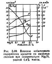 На рис. 3-10 и 3-11 показано влияние избыточного кремния на изменение удельного электрического сопротивления и механических свойств оплавов при концентрации Mg2Si, равном 0,4% (рис. 3-10) и 0,8% (рис 341).