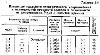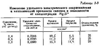 Повышение концентрации Mg2Si в сплавах приводит к улучшению механических свой ств спл авов, при этом величина удельного электрического сопротивления также возрастает (табл. 3-3).