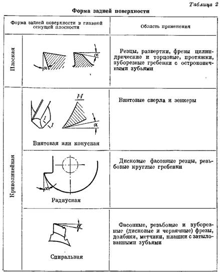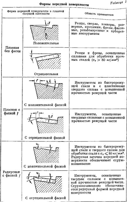 головки для нарезания резьбы вихревым способом, резцовые головки для нарезания зубчатых колес и др. На фиг. 2 изображены основные элементы рабочей части одно-и многолезвийных режущих инструментов. Сверло и фреза внешне не похожи на токарный резец, но рабочая часть их зубьев имеет все элементы резца, хотя некоторые из них конструктивно оформлены иначе. При работе большое значение имеют форма передней и задней поверхностей инструмента, углы пересечения этих поверхностей и режущие кромки (фиг. 3), составляющие его рабочую часть1. При изготовлении и заточке режущих инструментов форма передней и задней поверхностей выбирается в зависимости от рода обрабатываемого материала, типа инструмента и рода материала его рабочей части (табл. 1 и 2).