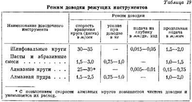 В табл. 19 приведены режимы доводки режущих инструментов шлифовальными кругами, пастами, алмазными кругами и алмазной пудрой. Качественная доводка возможна только в том случае, 7если режим операции оптимальный. Прежде всего необходимо следить за тем, чтобы не возникало нагрева инструментов, отрицательно сказывающегося на качестве доводимых поверхностей и на работоспособности доводочных инструментов. Особенно тщательно надо следить за отводом тепла из зоны резания при работе алмазными кругами. В качестве охлаждающей жидкости при доводке алмазными кругами рекомендуется применять эмульсию следующего состава (в г):