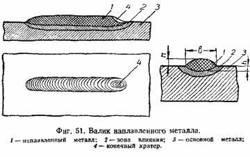 При перемещении дуги равномерно по намеченной линии получается полоска наплавленного металла, так называемый валик (фиг. 51), Поперечное сечение валика характеризуется глубиной расплавления h , высотой валика Я, шириной валика b , площадью поперечного сечения F. Технологически важными характеристиками