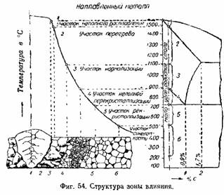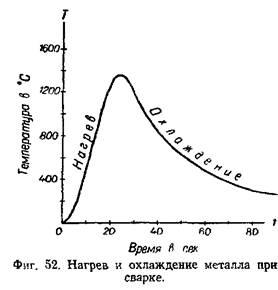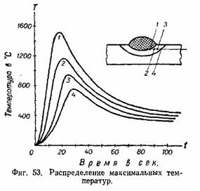 Процесс нагрева и охлаждения какой-либо точки металла зоны влияния показан на фиг. 52. Сначала происходит быстрое повышение температуры, а затем более замедленное, но всё же достаточно быстрое охлаждение металла, идущее главным образом за счёт отдачи тепла в прилегающие холодные слои металла. Максимальная температура, до которой нагревается металл данной точки зоны влияния, зависит от положения этой точки. На границе расплавления максимальная температура равняется температуре плавления металла. По мере удаления от границы расплавления максимально достигаемая температура понижается (фиг. 53).