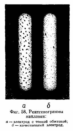 Если эта скорость велика, например, при сварке электродами с тонкой обмазкой, то количество включений очень велико. При качественных электродах, дающих много шлака, ванна находится дольше в жидком состоянии, успевает несколько отстояться и неметаллические включения имеют время всплыть на поверхность металла. Как правило, наплавленный металл при качественных электродах достаточно чист и мало засорён неметаллическими включениями. Для сравнения на фиг. 58 приведены рентгенограммы валиков, наплавленных электродами с тонкой и с качественной обмазкой. Неметаллические включения и газовые пузырьки в небольших размерах, определяемых соответствующими техническими условиями, иногда считаются допустимыми,