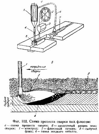 При сварке под флюсом сварочная дуга между концом электрода и изделием горит под слоем сыпучего вещества, называемого флюсом. На фиг. 102 схематически показан процесс сварки под флюсом. Голая электродная проволока 1 с катушки 2 подаётся в зону дуги автоматом 3. Впереди автомата из бункера 5 по трубке 4 на изделие подаётся флюс 8, не использованный при сварке остаток которого пневматически отсасывается обратно в бункер по трубке 6. Расплавленная и затвердевшая часть флюса образует на шве толстую шлаковую корку 7. На фиг. 102,6 схематически изображён продольный разрез зоны сварки под флюсом. Флюс насыпается слоем толщиной 50—60 мм, дуга утоплена в массе флюса и горит в жидкой среде расплавленного флюса, в газовом пузыре, образуемом газами и парами, непрерывно создаваемыми дугой. При среднем насыпном весе флюса около 1,5 г/см3 статическое давление слоя флюса на жидкий металл составляет 7—9 г/см2. Этого незначительного давления, как показывает опыт, достаточно, чтобы устранить нежелательные механические воздействия дуги на ванну жидкого металла, разбрызгивание жидкого металла и нарушение формирования шва даже при очень больших токах.
