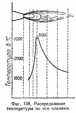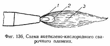 В зависимости от хода реакций сгорания ацетилена сварочное ацетилено-кислородное пламя имеет форму, схематически показанную на фиг. 136,